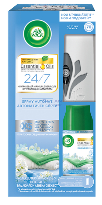 AIRWICK Freshmatic апарат с резерва Бял люляк 250 мл изпълва дома със свеж, флорален аромат и осигурява автоматично разпръскване за дълготрайна атмосфера на чистота и уют. Погледнете детайлното описание.