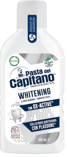 Pasta del Capitano Вода за уста Whitening 400 мл освежава дъха, намалява плаката и помага за естествено избелване на зъбите. Погледнете детайлното описание.