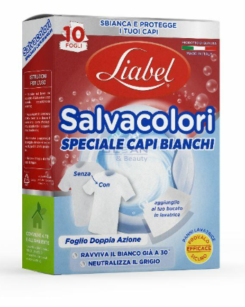 Liabel Salvacolore 10 бр. са специално разработени кърпички, които защитават белите дрехи по време на пране. Те улавят разтворените багрила и замърсявания от водата, предотвратявайки появата на сивкав или жълтеникав оттенък върху тъканите. Подходящи за използване с всички видове перилни препарати и програми на пералнята. Практични и лесни за употреба, кърпичките спомагат за дълготрайно запазване на белотата на любимите дрехи.