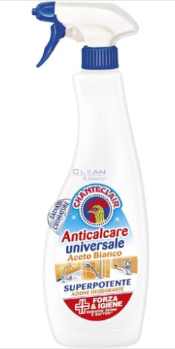 Chanteclair Препарат Анти-варовик с бял оцет е мощно почистващо средство, създадено за бързо и ефикасно отстраняване на варовикови отлагания, ръжда и сапунени налепи от мивки, батерии, душове, плочки и други повърхности, изложени на твърда вода. Формулата с натурален бял оцет разтваря минералните остатъци, като същевременно придава свеж аромат и блясък. Подходящ за баня и кухня, включително за почистване на домакински уреди като чайници и кафемашини (следвайте инструкциите на производителя).