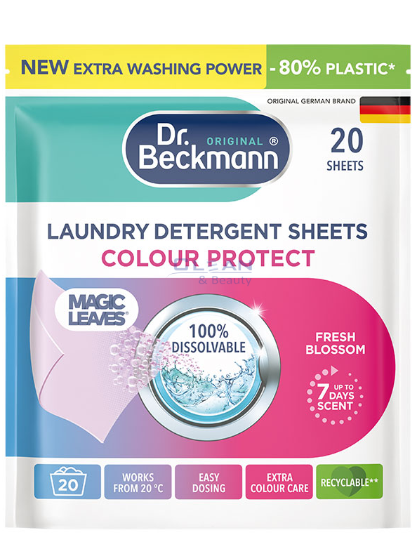 Dr. Beckmann Magic Leaves Fresh Blossom 20 бр. са създадени специално за грижа за цветните тъкани. Те осигуряват ефективно изпиране, като се разтварят напълно по време на прането и действат директно върху замърсяванията. Благодарение на формулата си, предпазват цветовете от избледняване и придават приятен свеж флорален аромат. Листчетата са лесни за дозиране, спестяват място и са подходящи за пране при ниски температури, което щади тъканите и пести енергия.