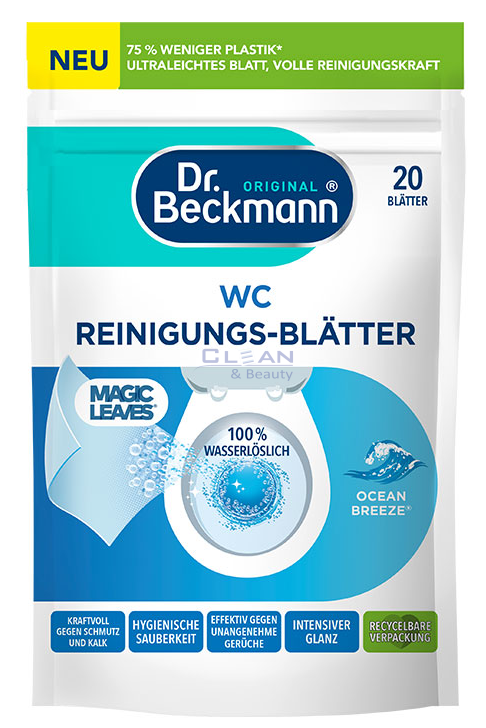 Dr. Beckmann WC листчета Ocean Breeze 20 бр. са практично решение за поддържане на тоалетната чиста и освежена. Те се разтварят моментално при контакт с вода и освобождават активни съставки, които помагат за предотвратяване на варовик и замърсявания. С всяко пускане на водата се отделя свеж морски аромат, който осигурява приятно усещане за чистота. Удобната форма на листчета ги прави лесни за употреба и хигиенични, като са ефективна алтернатива на традиционните WC блокчета.