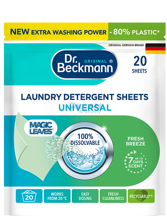 Dr. Beckmann Magic Leaves Intense Fresh 20 бр. са иновативен и компактен вариант за пране – листчета, които заменят традиционните прахове и гелове. Те се разтварят напълно във водата и действат ефективно срещу замърсявания, като оставят дрехите дълбоко почистени и с интензивен свеж аромат. Универсалната им формула е подходяща за бели, цветни и деликатни тъкани, като запазва цветовете и влакната. Работят отлично и при ниски температури, което пести енергия и щади тъканите.