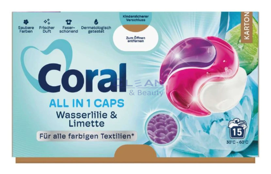 Coral Color Lotus & Lime са високоефективни капсули за цветно пране, разработени по немски стандарти за грижа и хигиена. Съдържат концентриран гел, който премахва замърсяванията и запазва цветовете наситени дори след многократно пране. Ароматът на лотос и лайм оставя дрехите свежи и приятно ухаещи за дълго. Формулата се разтваря напълно дори при ниски температури и е щадяща към влакната на тъканите.