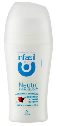 Infasil Neutro Extra Delicato 50 мл е създаден с грижа за чувствителната кожа и е предназначен да осигури надеждна защита от неприятна миризма и изпотяване, без да причинява раздразнения. Благодарение на иновативната си формула, продуктът не оставя бели или жълти следи по дрехите, включително върху цветни тъкани.